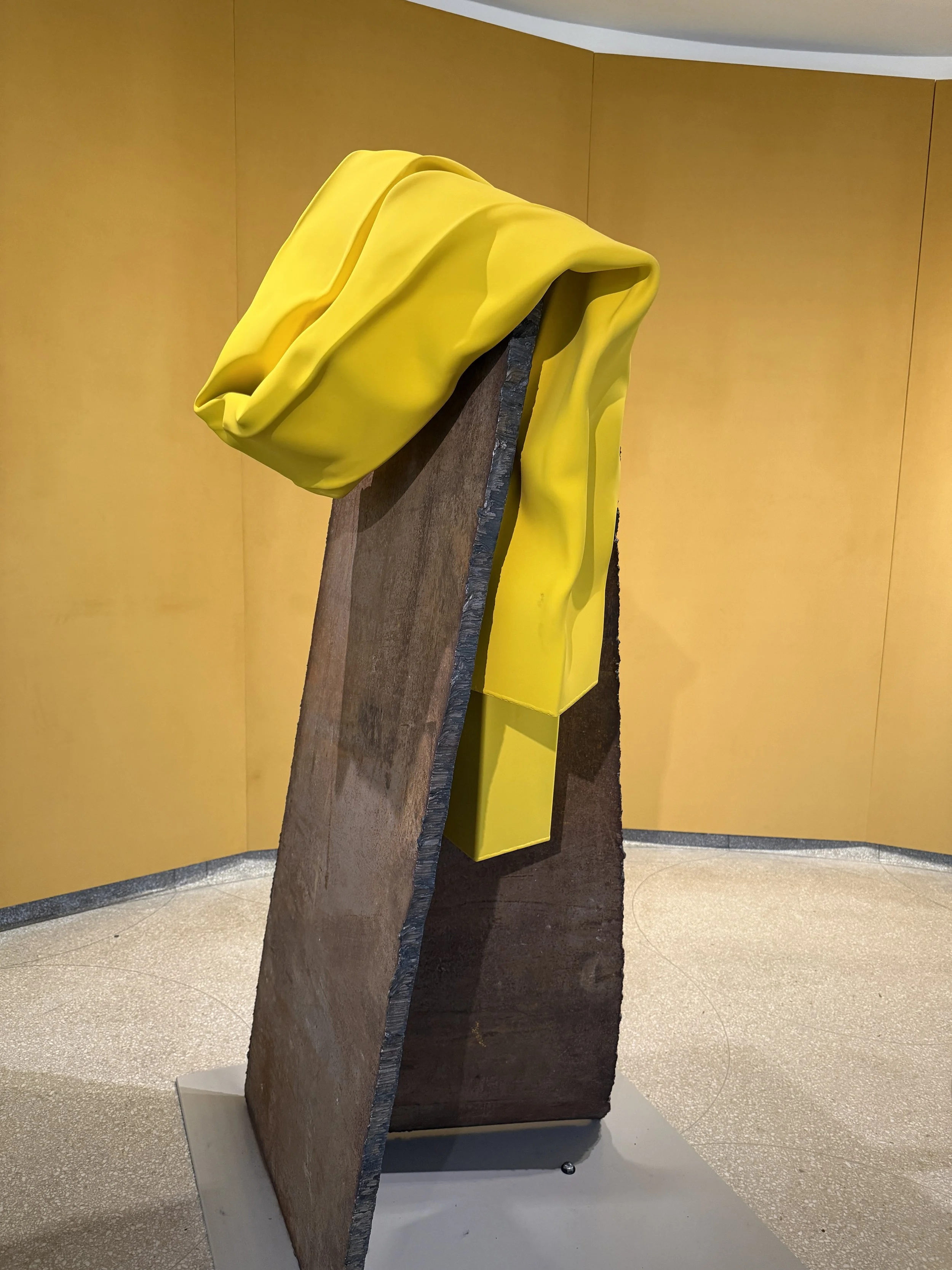 I had the earliest entry time to see Carol Bove at the Guggenheim. I had very mixed feelings about this wide-ranging exhibition; some of it just didn’t work for me, but some of it was terrific. I think the most successful works are the bent square steel tubes; the installation Sweet Charity was like a fanciful forest of these forms, combined with slab-like armatures propping them up. I was reminded of Japanese tree-propping, along with all of the usual associations with Bove’s antecedents: Serra, Chamberlain, and even Henry Moore and Joel Shapiro. Interestingly, the day before (my Upper East Side day) I was walking on Madison Ave., past all of the designer clothing stores, where I saw shop after shop displaying gorgeous spring frocks in the most delicious colors: lemony yellows, soft lime greens, gorgeous pinks. When I entered the Guggenheim the next morning, something about Bove’s surfaces reminded me of these chiffon dresses. Her paint surface is almost velvety, and the hard metal has been bent and crumpled under enormous pressure, creating sinewy folds and draping, It’s a neat trick to be sure. I wasn’t as convinced by the rest of the show— the sad arrangements of detritus (nets, feathers, driftwood, etc.) were particularly weak. The early bookshelf works fared slightly better. The reflective metal circles, placed on the edges of the winding ramp, were a nod to Frank Lloyd Wright, but didn’t float my boat. Anyway, I had a lot of complaints about much of the work in this exhibition, but I left with greater appreciation for the crushed metal works, which are lyrical, humorous, art historically relevant, technically ambitious, and really fun to look at.