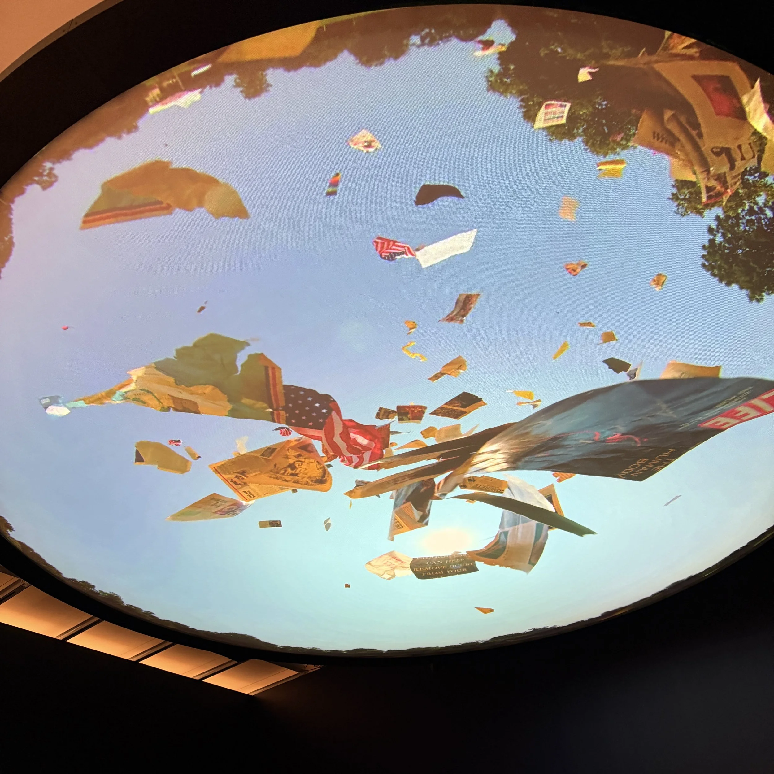 I don’t like to bash people, or exhibitions, so I will restrain myself, but I will say that the whole thing was kind of depressing, materially/formally lacking, and hell bent on commenting on things that I am not terribly interested in. I prefer work that is more of a perceptual experience. I did not glean any feelings of joy, love, hopefulness, beauty, or even deep personal impetus. The one work that will most definitely stay with me is Michelle Lopez’ Pandemonium, which is a high definition video projected onto a circular screen on the ceiling of a dark gallery. Lopez had created a tornado machine that whips up detritus and spins it round in a terrifying, apocalyptic fashion overhead. It’s literally as if the sky is falling. It reminded me of natural disasters, papers and ash cascading down from the World Trade Center on 9/11, and lots of scary movies. The soundtrack is very horror-film—whirring and ominous. Of course, you can hear it throughout the gallery, so it rather casts a pall on things, amplifying the sad sack, downer feeling that seemed to pervade most of the Biennial.