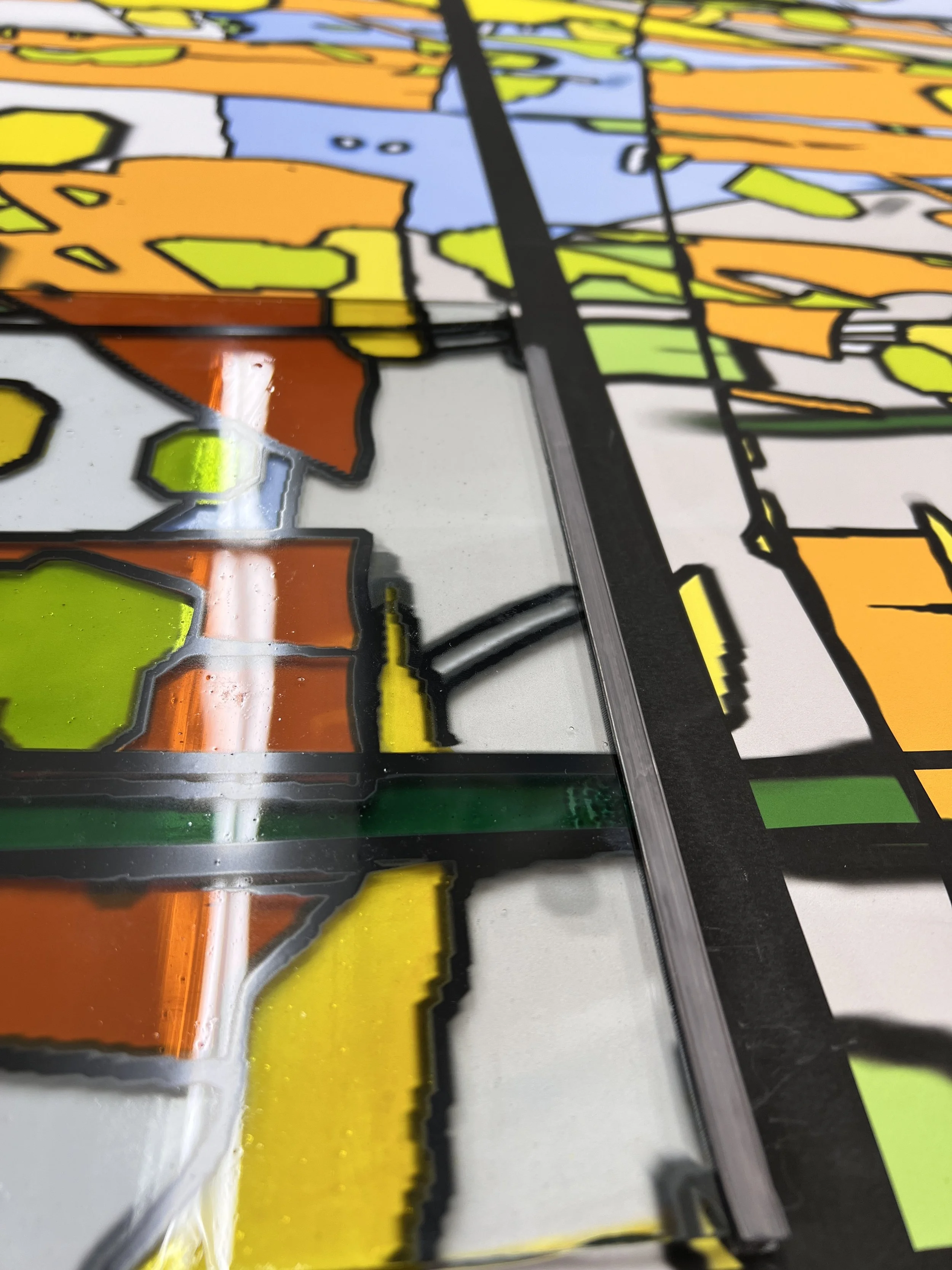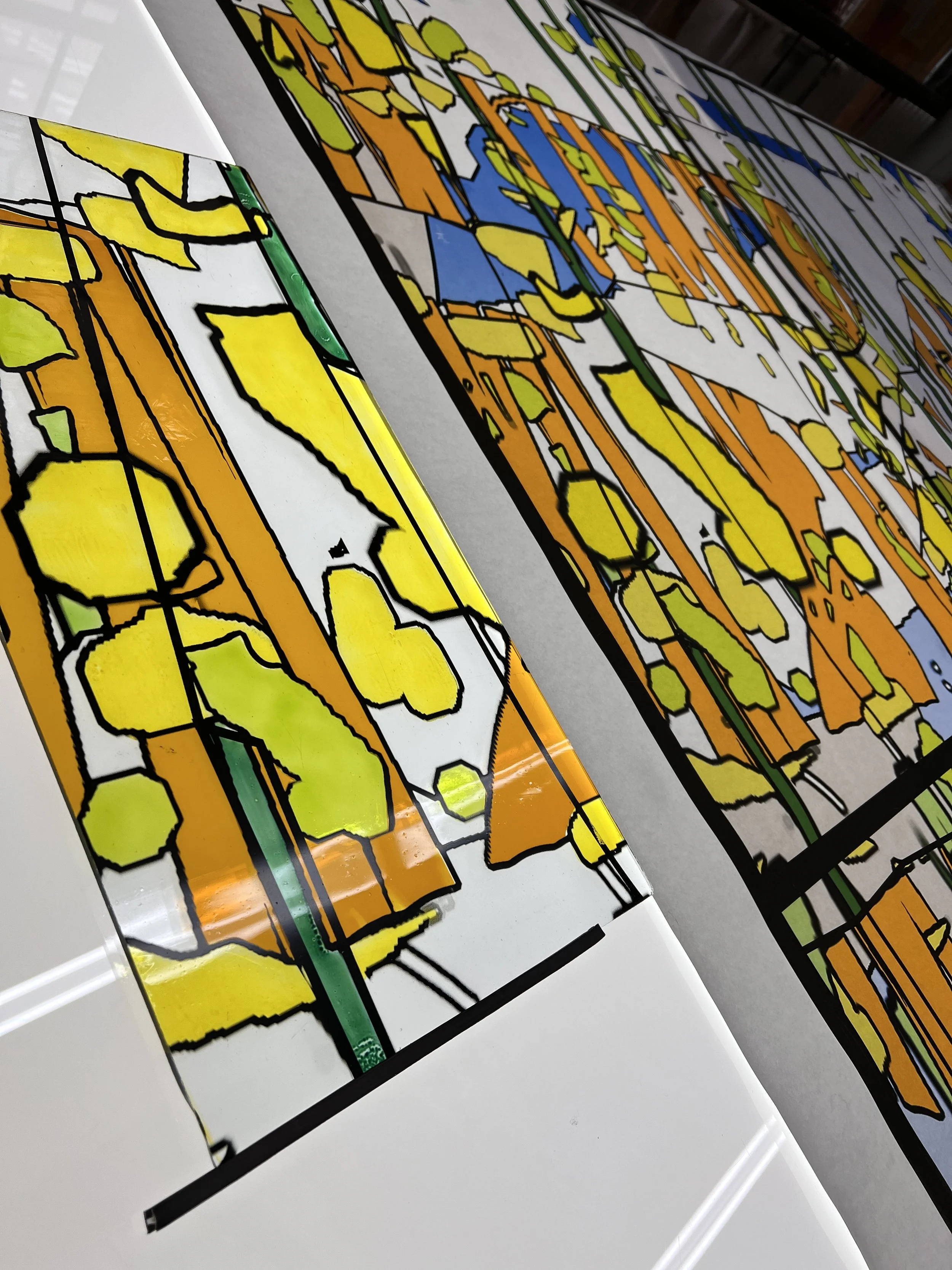 One of the most challenging aspects of this project was deciding on the location of the lead lines. The leading is structural, and also esthetic, and it should enhance shapes without truncating them in an unpleasant way. I drew many versions of the lead line pattern, using tracing paper over a printed sketch and also working in Illustrator. Basically, the lead lines follow a loose grid. We had decided that specific colors would be leaded throughout the piece, which I had to take into consideration as I created the grid. Any shape that is held by lead needs to connect to the overall structure.