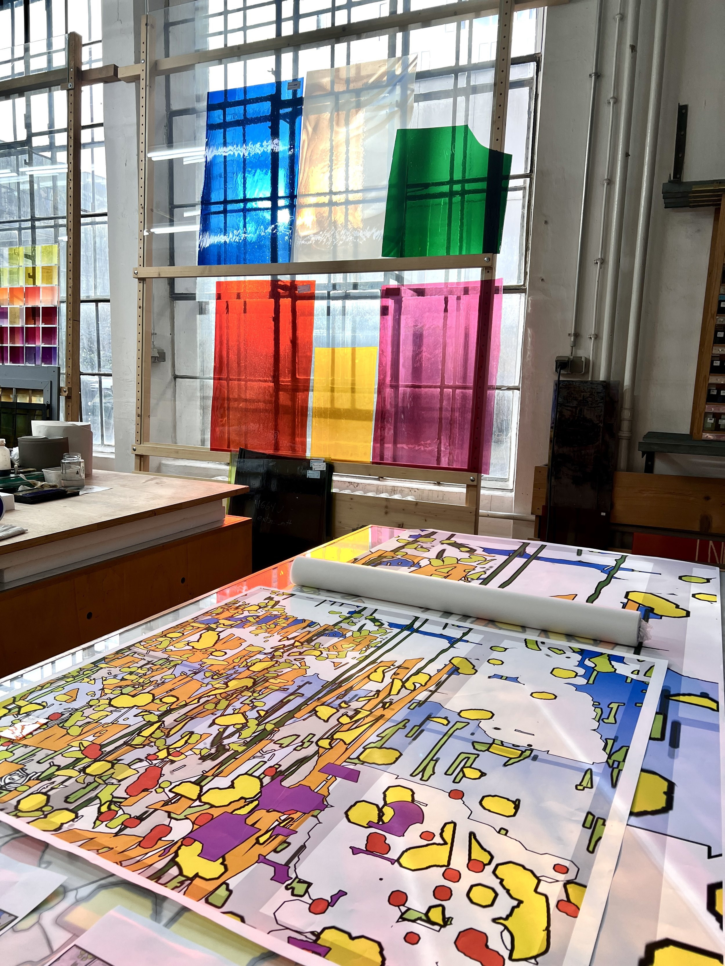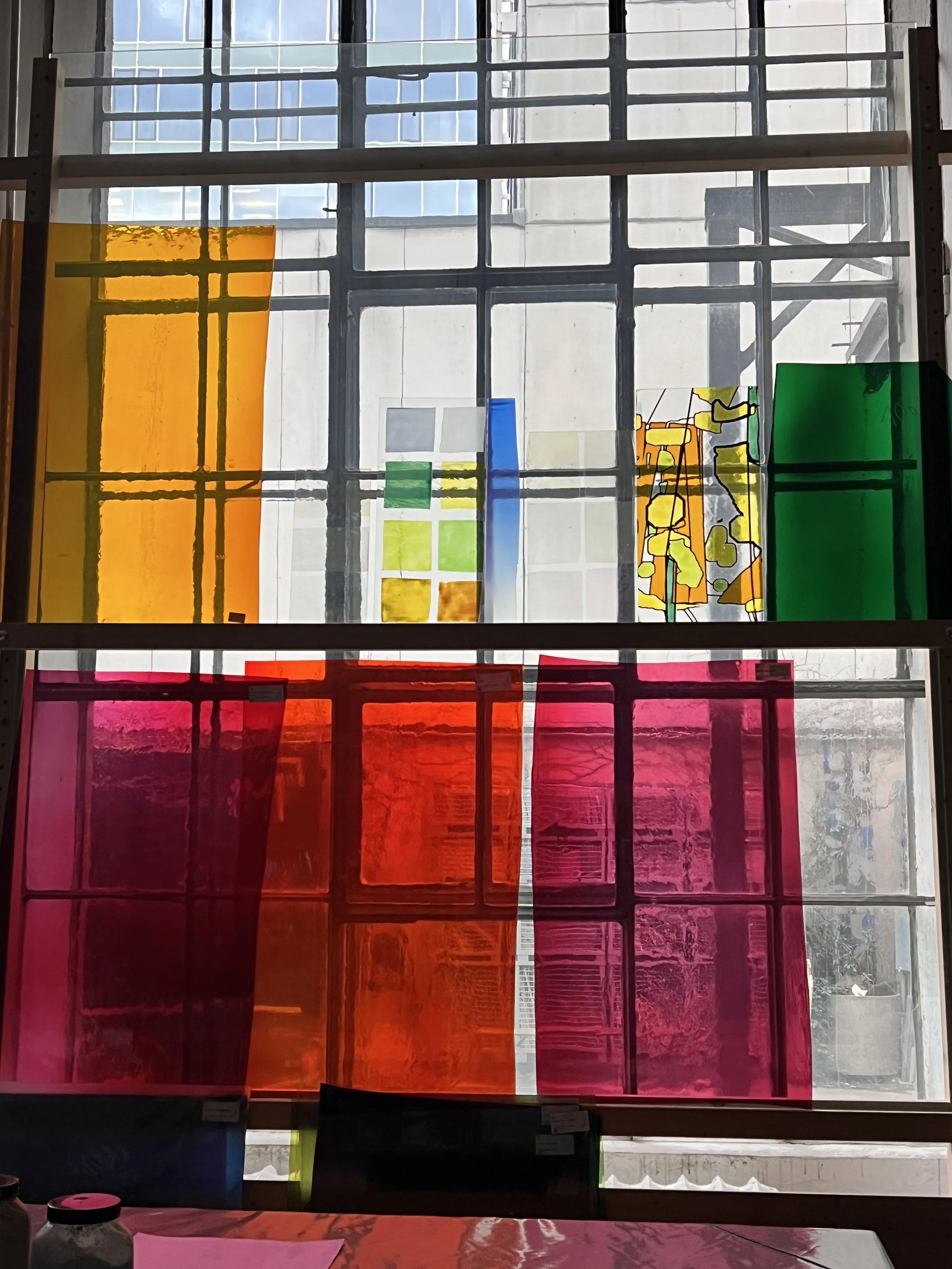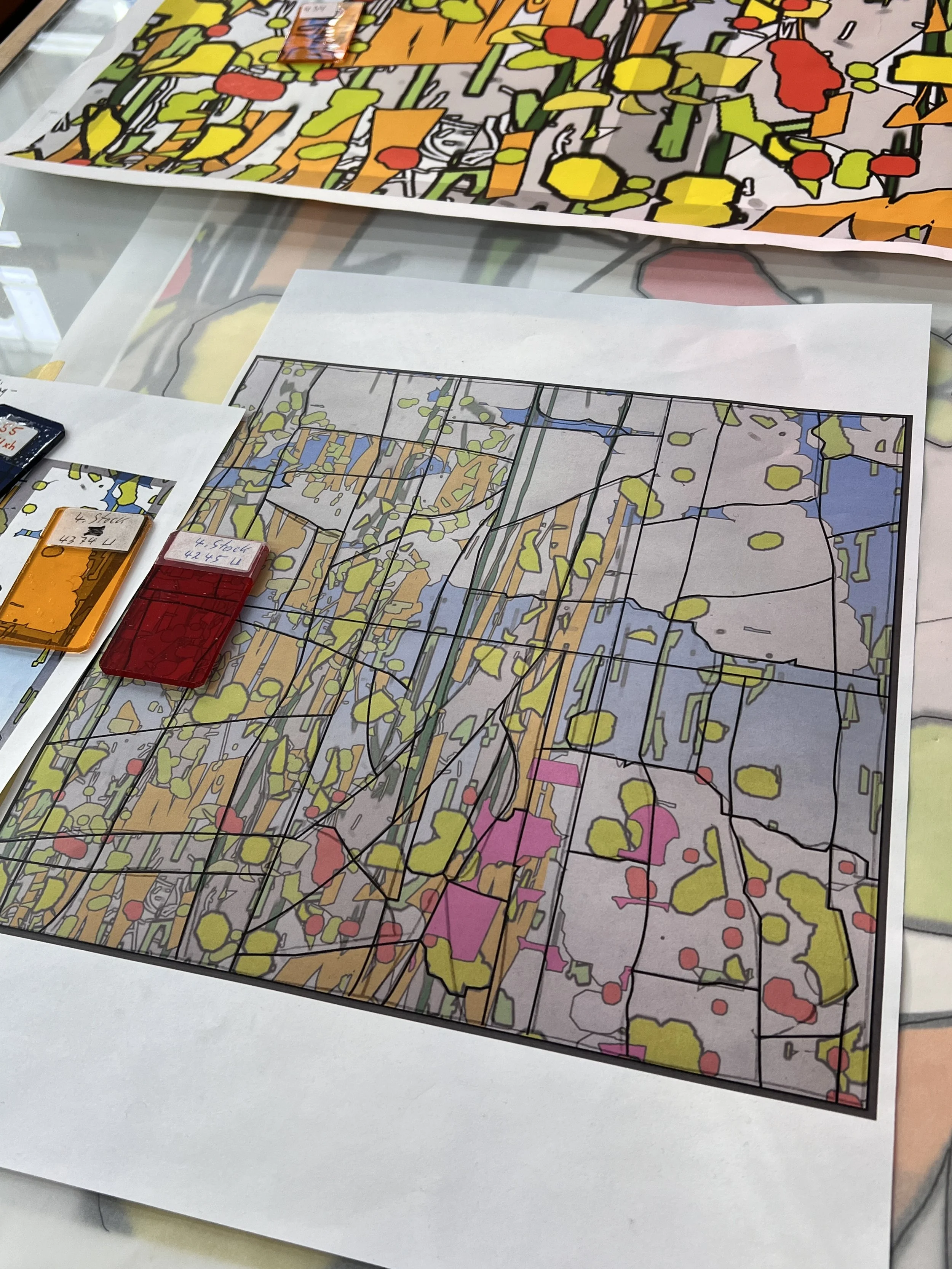 By the end of my week in Munich, we had a rough idea of the lead line pattern, and had determined a process for fabrication. This is the final color palette for the window. The big slabs of solid color are mouth-blown glass, and the samples at the top of the photo were created by painting colors with glass pigments. The glass is then fired, and the colors permanently fuse to the glass.