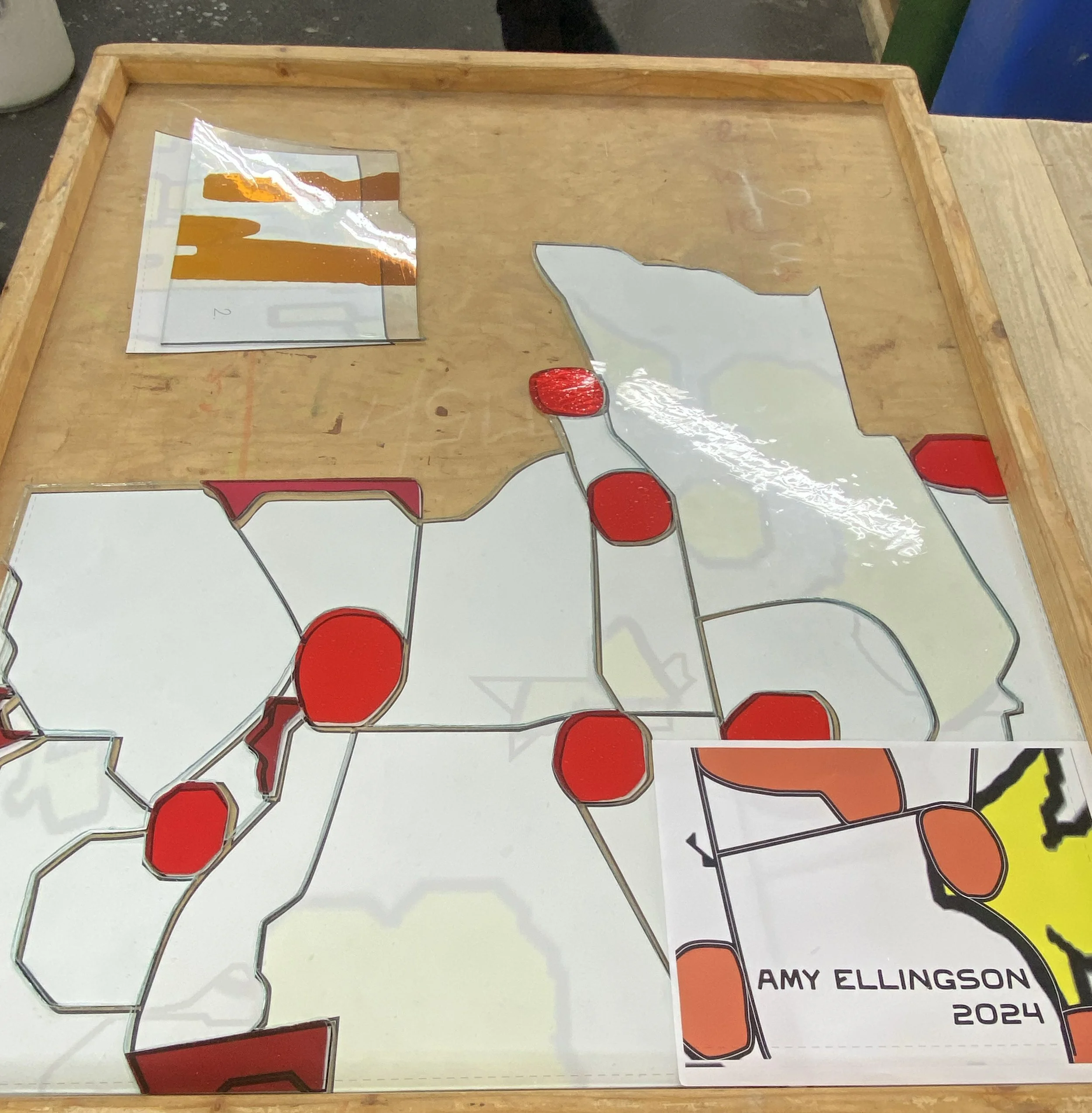 After my visit to FMoM, the artisans began the long task of creating the window. They built a wooden tray for each section, and began to carefully cut and piece the colors.